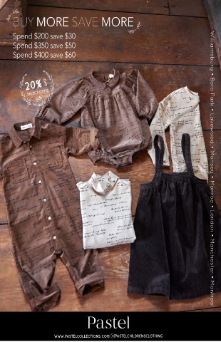 BUY MORE SAVE MORE Spend $200 save $30 Spend $350 save $50 Spend $400 save $60 20% off Select items Williamsburg • Boro Park • Lakewood • Monsey • Monroe • London • Manchester • Montreal www.Pastelcollections.com 21 Pastelchildrensclothing