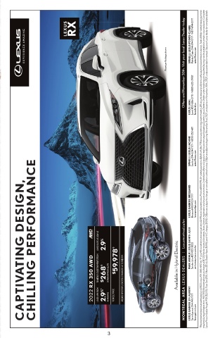 SPINELLI LEXUS LACHINE Lachine 514-634-7177 • 1-800-352-6111 spinellilexus.com *Representative lease example based on a 2022 Lexus RX 350 AWD sfx ‘P’ on a 40 month term at an annual rate of 2.9% and Complete Lexus Price of $59,978. Bi-weekly pa