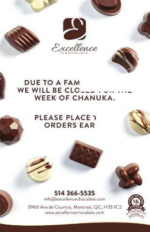 DUE TO A FAMILY SIMCHA WE WILL BE CLOSED FOR THE WEEK OF CHANUKA. PLEASE PLACE YOUR ORDERS EARLY. 514 366-5535 info@excellencechocolate.com 3960 Ave de Courtrai, Montreal, QC, H3S 1C2 www.excellencechocolate.com 30