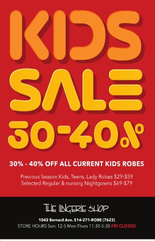 Previous Season Kids, Teens, Lady Robes $29-$59 Selected Regular & nursing Nightgowns $69-$79 1042 Bernard Ave. 514-271-ROBE (7623) STORE HOURS Sun: 12-5 Mon-Thurs 11:30-5:30 FRI CLOSED 57