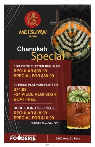 Chanukah Special 100 PIECE PLATTER REGULAR REGULAR $99.99 SPECIAL FOR $89.99 50 PIECE PLATINUM PLATTER $74.99 +24 PIECE VEGI SUSHI BOAT FREE SUSHI DONUTS 3 PIECE REGULAR $18.99 SPECIAL FOR $16.99 6680 Ave. Du Parc 27