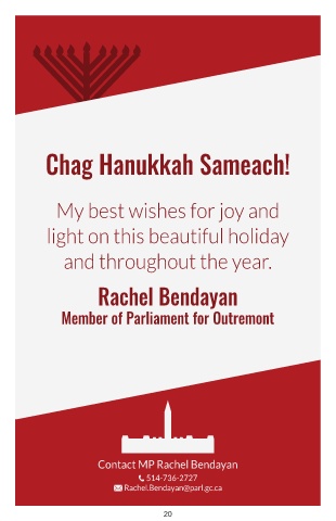 Chag Hanukkah Sameach! My best wishes for joy and light on this beautiful holiday and throughout the year. Rachel Bendayan Member of Parliament for Outremont Contact MP Rachel Bendayan 514-736-2727 Rachel.Bendayan@parl.gc.ca 20