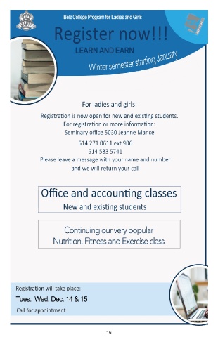 Belz College Program for Ladies and Girls LEARN AND EARN Continuing our very popular Nutrition, Fitness and Exercise class Tues. Wed. Dec. 14 & 15 16