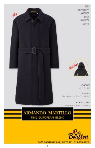 NEW SHIPPMENT ARMANDO MARTILLO ARRIVED WOOL SHABBES COATS SIZES 4 TO 22 3 colors -BLACK -NAVY -GREY 3 LENGTHS -SHORT – 3/4 -LONG ARMANDO MARTILLO -WITH REMOVABLE HOOD FINE EUROPEAN BLEND 5425 CASGRAIN AVE, SUITE 401, 514-276-9828 7