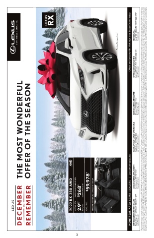 2022 RX 350 AWD BI-WEEKLY LEASE PAYMENTS FROM LEASE APR FROM § $ 268 2.9 %* DOWN PAYMENT $6,778* 40 MONTHS VEHICLE PRICE 48,000 KM/TERM, EXCESS CHARGED AT 0.20$/KM. MONTREAL AREA LEXUS DEALERS SPINELLI LEXUS POINTE-CLAIRE Pointe-Claire 514-694-0771 • 1-877-694