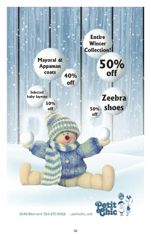 Entire Winter Collection! Mayoral & Appaman 50% coats off 40% off Selected baby layette Zeebra 50% off 50% shoes off 1046 Bernard 514.271.9022 c petitchic_mtl 36