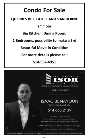 Condo For Sale QUERBES BET. LAJOIE AND VAN HORNE nd 2 floor Big Kitchen, Dining Room, 2 Bedrooms, possibility to make a 3rd Beautiful Move-in Condition For more details please call 514-554-4951 44