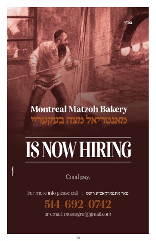 ד״סב Montreal Matzoh Bakery יירעקעב הצמ לאירטנאמ IS NOW HIRING Good pay. For more info please call : טפור עיצאמראפניא ראפ 514-692-0742 or email: mosesgru@gmail.com 14