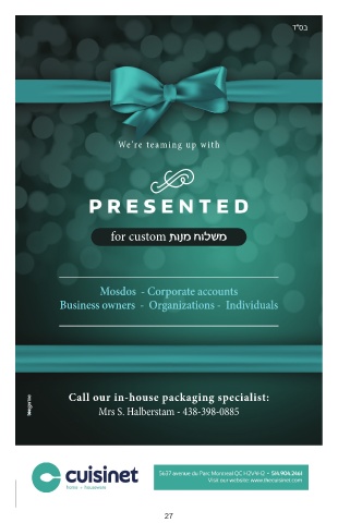 We're teaming up with for custom תונמ חולשמ Mosdos - Corporate accounts Business owners - Organizations - Individuals Call our in-house packaging specialist: Mrs S. Halberstam - 438-398-0885 27