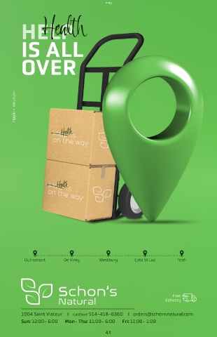 ד"סב Health Outremont De Vimy Westbury Cote St Luc Tosh Free delivery 1004 Saint Viateur II Call/Text: 514-418-6360 II orders@schonsnatural.com Sun: 12:00- 6:00 Mon- Thu: 11:00- 6:00 Fri: 11:00- 1:00 41