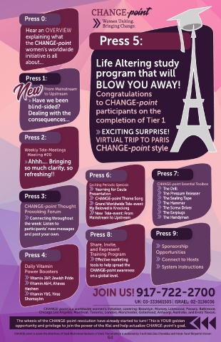 CHANGE-point is a worldwide women’s initiative, covering: Brooklyn, Monsey,Lakewood, Passaic, Baltimore,