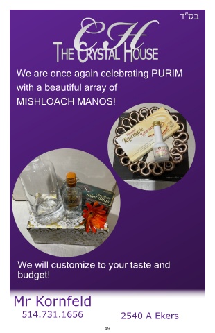 We are once again celebrating PURIM with a beautiful array of MISHLOACH MANOS! We will customize to your taste and budget! Mr Kornfeld 514.731.1656 2540 A Ekers 49