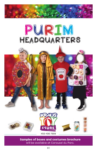 ד"סב PURIM HEADQUARTERS 450-430-7908 Samples of boxes and costumes brochure will be available at Carousel du Parc. 61