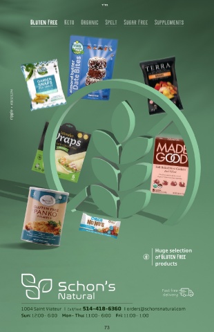 ד"סב Huge selection of Gluten Free products Fast free delivery 1004 Saint Viateur II Call/Text: 514-418-6360 II orders@schonsnatural.com Sun: 12:00- 6:00 Mon- Thu: 11:00- 6:00 Fri: 11:00- 1:00 73
