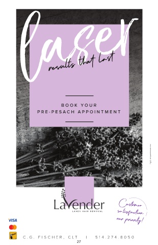 laser B OOK Y O UR PRE-PES A CH APPO INT ME NT INFO@MYNTDESIGN.COM LA S ER HAIR RE MO V AL SPEC K C .G. FIS CHE R, C L T | 514.274.8050 27