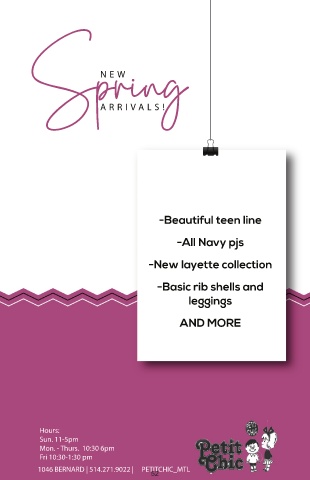 Wishing Wishing Spring NE W ARRIV ALS -Beautiful teen line -All Navy pjs -New layette collection -Basic rib shells and leggings AND MORE Hours: Sun. 11-5pm Mon. - Thurs. 10:30 6pm Fri 10:30-1:30 pm 1046 BERNARD | 514.271.9022 | PETITCHIC_MTL 52