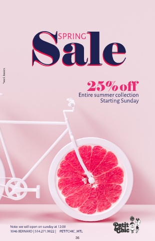 Sale Sale SPRING *excl. basics 25% off Entire summer collection Starting Sunday Note: we will open on sunday at 12:00 1046 BERNARD | 514.271.9022 | PETITCHIC_MTL 36