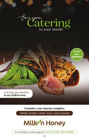 ד“סב We now cater shabbosim! Catering your simchos in any hall in town. Consider your simcha complete Milchig / fleishig / rentals / decor / party planning For booking or other inquiries: 514.271.5700 / 514.941.9007 30