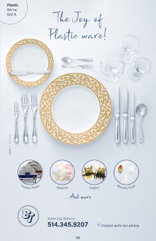 Plastic ד"סב We’ve Got It. The Joy of Plastic ware! C om bo Plates Mousse Cups Napkins Cutlery ...And more Same day delivery 514.345.9207 Contact us for our pricing 59