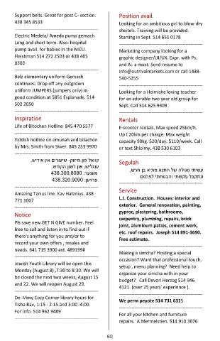 be closed the next two weeks, August 15 budget? Call Devori Herzog 514 946