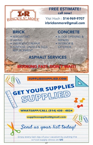 SUPPLIESSUPPLIED.COM GET YOUR SUPPLIES SUPPLIED WHATSAPP/CALL (514) 430 - 4824 suppliessupplied@gmail.com Send us your list today! Enjoy every last day of your vacation by putting the school supply stress on US! 47