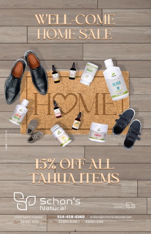 WELL-COME WELL-COME HOME SALE HOME SALE 15% OFF ALL 15% OFF ALL TAHUA ITEMS TAHUA ITEMS Fast free delivery 1004 Saint Viateur II Call/Text: 514-418-6360 II orders@schonsnatural.com Sun: 12:00- 6:00 Mon- Thu: 11:00- 6:00 Fri: 11:00- 1:00 4