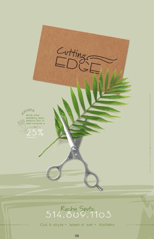 Kallahs Kallahs ••••••••••••••••••••••••••••••••••••••••••••••••••••••• book your wedding date before Oct 31 and receive a i 25% discount • •• •• • • • • • • • • • •• • • • •• • • Ruchy Sputz 514.809.1103 Cut & style • Wash n’ set • Kallahs 58