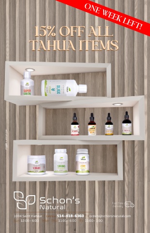 ONE WEEK LEFT! 15% OFF ALL 15% OFF ALL TAHUA ITEMS TAHUA ITEMS Fast free delivery 1004 Saint Viateur II Call/Text: 514-418-6360 II orders@schonsnatural.com Sun: 12:00- 6:00 Mon- Thu: 11:00- 6:00 Fri: 11:00- 1:00 4