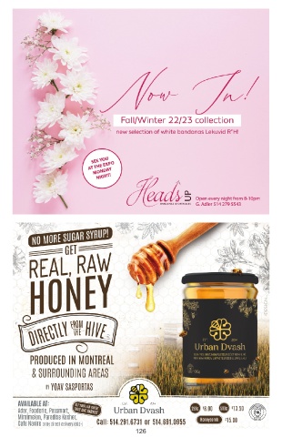 GET BY YOAV SASPORTAS AVAILABLE AT: $ $ GET YOUR JAR QUICK! Adar, Fooderie, Passmart, ONLY ONE HARVEST 250g 8.00 500g 13.50 Mimimelon, Paradise Kosher, Honeycomb $ 15.00 Cafe Navire or by direct delivery (60$+) Call: 514.291.6731 or 514.691.0955 126