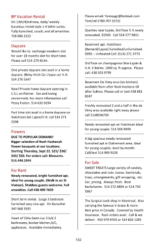 Viateur). Shabbos guests welcome. Full hechsherim. 514 272 6804 or 514 730