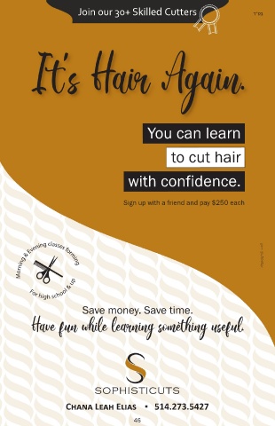 L o Join our 30+ Skilled Cutters “ You can learn to cut hair with confidence. Sign up with a friend and pay $250 each Morning & Evening classes forming For high school & up SOPHISTICUTS C���� L��� E���� ▪ 514.273.5427 46