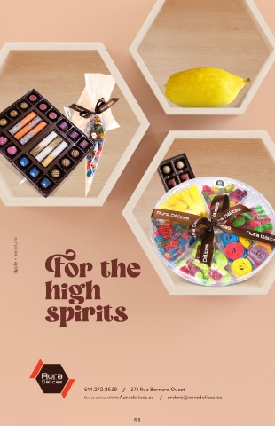For the high spirits 514.272.2639 // 371 Rue Bernard Ouest Order online: WWW.Auradelices.ca // orders@auradelices.ca 51