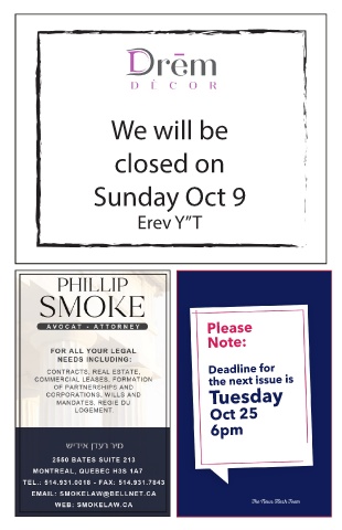 We will be closed on Sunday Oct 9 Erev Y”T ד“סב Please Note: Deadline for the next issue is Tuesday Oct 25 6pm e News Flash Team