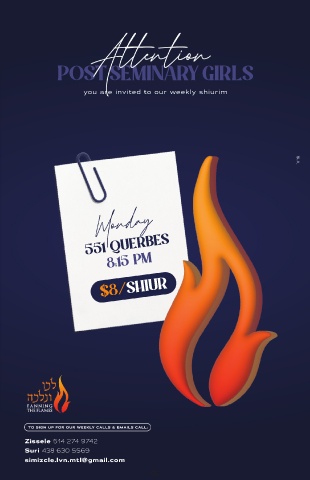 Attention POST SEMINARY GIRLS you are invited to our weekly shiurim Monday 551 QUERBES 8:15 PM $8/SHIUR TO SIGN UP FOR OUR WEEKLY CALLS & EMAILS CALL: Zissele 514 274 9742 Suri 438 630 5569 simizcle.lvn.mtl@gmail.com 56