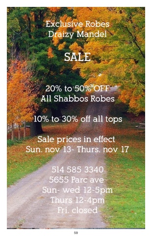Exclusive Robes Draizy Mandel SALE 20% to 50% OFF All Shabbos Robes 10% to 30% off all tops Sale prices in effect Sale prices in effect Sun. nov 13- Thurs. nov 17 514 585 3340 5655 Parc ave Sun- wed 12-5pm Thurs 12-4pm Fri. closed 59