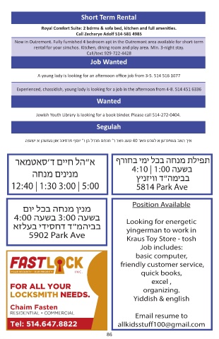 Experienced, chassidish, young lady is looking for a job in the afternoon from 4-8. 514 451 6336