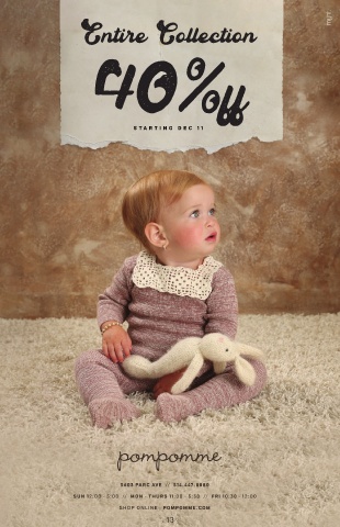 Entire Collection 40% ST ARTIN G DEC 11 5603 PARC AVE // 514.447.8880 SUN 12:00 - 5:00 // MON - THURS 11:00 - 5:30 // FRI 10:30 - 12:00 SHOP ONLINE - POMPOMME.COM 13