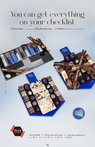 You can get everything on your checklist Memorable (For a long time) Mouthwatering ( ) Modern (Compliments my decor perfectly) 514.272.2639 // 371 Rue Bernard Ouest // orders@auradelices.ca Sun: 12 - 5 Mon - wed: 10 - 6 Thu: 10 - 9 Fri: 9:30 -2 39