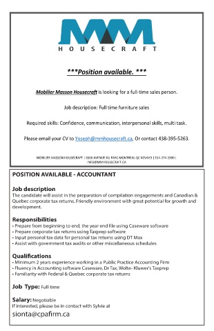 Mobilier Masson Housecraft is looking for a full-time sales person.
