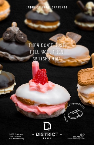 Indulge your cravings They don’t just fill you, they satisfy you. Classic taste of goodness 5679 Park Ave 709 Lucerne 514.735.1174 5400 Westbury www.Districtbagel.com 39