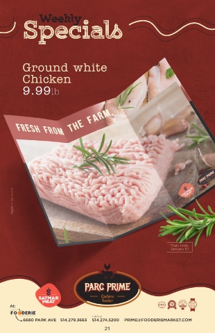 Ground white Chicken 9.99lb *Sale ends January 10 Call/Text 6680 PARK AVE 514.279.3663 514.274.5200 PRIME@FOODERIEMARKET.COM 21
