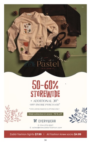 ד״סב 50-60% * STOREWIDE + ADDITIONAL 30 % off entire purchase * * EXCLUDING BASICS CLOTHING ONLY SS22 collection in store - 70 % off P: 514-272-9327 E: sales@everywearfashion.com Zubbi fashion tights $7.99 I All fashion knee socks $4.99 34