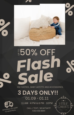 Flash UP TO 50% OFF Sale ON FOOTIES , BABY LATETTE AND ACCESSORIES. 3 DAYS ONLY!! 01.09 - 01.11 11 AM - 4 PM & 8 PM - 10PM OFFERING DELIVERY CALL / TEXT / WHATSAPP TO MONTREAL 438.408.9844 36