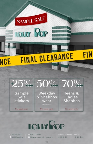 FINAL CLEARANCE FINAL CLEARANCE FINAL CLEARANCE 25% 50% + OFF OFF 70% OFF Sample Weekday Teens & Sale & Shabbos Ladies stickers wear Shabbos *Exc basics This week only! This week only! This week only! 19