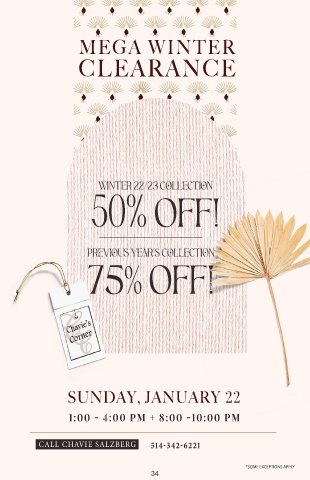 MEGA WINTER CLEARANCE WINTER 22/23 COLLECTION 50% oFF! PREVIOUS YE ’S COLLECTION 75% off! SUNDAY, JANUARY 22 1:00 - 4:00 PM + 8:00 -10:00 PM *SOME EXCEPTIONS APPLY 34
