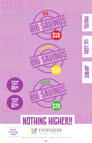 RED $ pastel $10 yellow lil legs $ $15 jaybee Fashion GREEN Tights $5 99 $ Fashion socks $2 99 $20 Nothing Higher!! SS23 3 SS2 Arriving ng Arrivi Dail Daily! y! Hours: Sun. 12-5 Mon.-Thurs 11 -6 Fri. 11-1 48