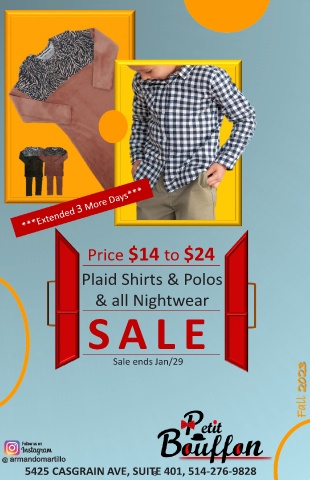 Price $14 to $24 Plaid Shirts & Polos & all Nightwear S A L E Sale ends Jan/29 t r a i o l l m a r @ armandomartillo a o m d n @ 5425 CASGRAIN AVE, SUITE 401, 514-276-9828 8