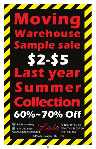 Moving Warehouse Sample sale $2-$5 Last year Summer Collection 60%~70% Off lulukidsclothing SUNDY 11:00-4:00 877-799-5858 MON-THU 11:00-5:30 www.lulukidsclothing.com FRI 10:30-1:00 5415 Av. Casgrain H2T 1X6 18