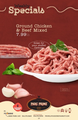 Ground Chicken & Beef Mixed 7.99lb Great for your stuffed Cabbage *Sale ends February 21 Call/Text/Whatsaap 6680 PARK AVE 514.279.3663 514.274.5200 PRIME@FOODERIEMARKET.COM 31