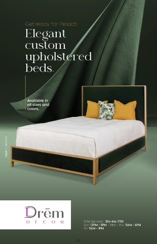 Get ready for Pesach Elegant custom upholstered beds. Available in all sizes and colors. 1036 Bernard 514-416-7701 Sun: 12PM - 5PM Mon - thu: 11AM - 6PM Fri: 11AM - 1PM 51